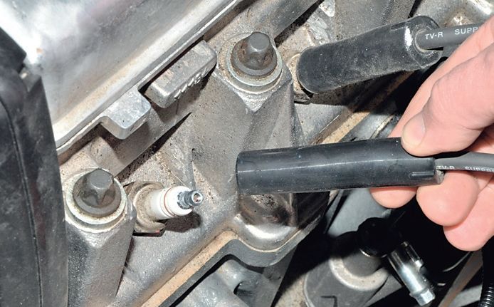 Высокой головкой «на 16» с удлинителем (или свечным ключом) выворачиваем свечу.
