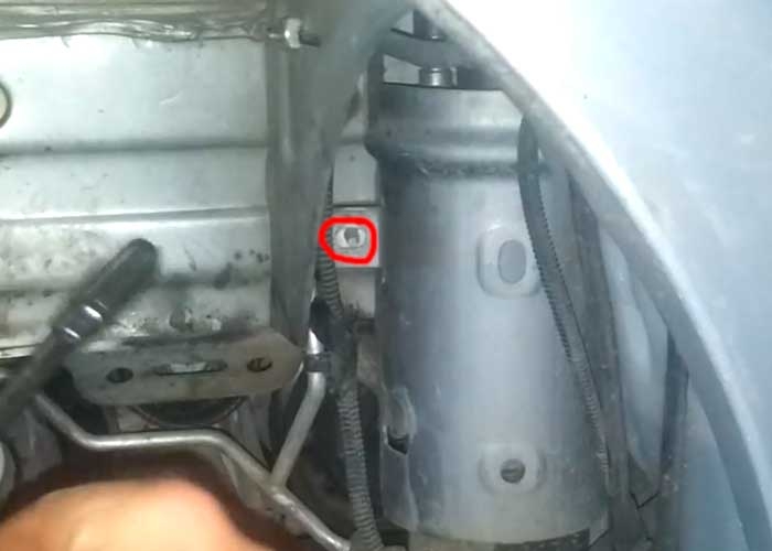 Изначально нужно снять правое переднее колесо и расположенную ближе к передней области авто Меган часть подкрылка. Приподнимаем фильтр вверх и изымаем его с кронштейна. После, отключаем питание, путем поднятия защелки и оттягивания кабеля назад, как указано на фото.