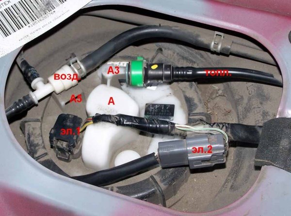Знакомая нам крышка (А) фильтра, выход фильтра (А3) на топливную магистраль (топл.), подставка (А5) для крепления воздуховода (возд.), электрические коннекторы (эл.1 и эл.2).