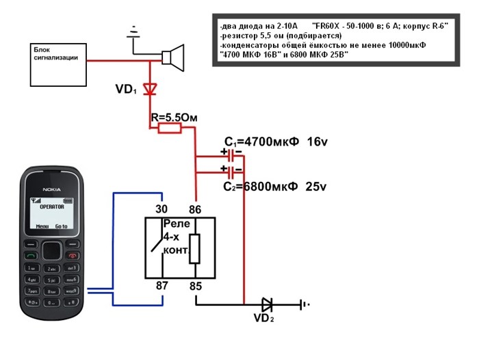 Телефон устанавливается в потайном, но доступном месте, потому что при отключении аккумулятора, он через несколько дней отключится, не забывайте его включать. R5 подбирается таким образом, чтобы не грелся аккумулятор телефона, около 30 Ом. Питание коммутатора подключается к замку зажигания через предохранитель или к точке уже имеющей слаботочный предохранитель. Реле блокировки устанавливается отдельно и размыкает цепь зажигания или других приборов отвечающих за работу двигателя, в рабочем состоянии реле включено. В своём телефоне для удобства установите номер на быстрый набор одной кнопкой, а также запомните или запишите номер, на случай если не будет возможности звонить с вашего телефона. Для включения функции оповещения, используйте схему “схема оповещения”. Телефон, находящийся в автомобиле настройте на вызов одной кнопкой, на ваш номер, к этой кнопке аккуратно припаяйте вывод “ вызов”, а к кнопке отбой вывод “отбой» (определить и подпаятся к разъёму матрицы кнопок). Реле подключите к + сирены. Если на автомобиле нет сигнализации, подключитесь к концевикам дверей, сменив полярность, в случае охраны гаража или квартиры, так же используйте концевик или геркон. На своём телефоне внесите этот номер как “тревога“ и поставьте отдельную мелодию. Если ответить на вызов “тревога”, то можно прослушать происходящие на объекте и принять необходимые меры. Если отбой и выключение телефона у вас на одной кнопке, подключайте только вызов. Раз в 4 месяца немного пополняйте баланс, чтобы не заблокировали номер.