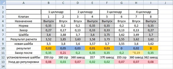 Размер шайбы подбирается путем несложного математического расчета: если зазор между кулачком и клапаном составляет, например 0.15 мм, а необходимо сделать 0.35 мм при том, что шайба 3.40 мм, то 3.40-0.20=3.20 мм – толщина необходимой шайбы.Аналогично примеру подбор производится при других зазорах для всех клапанов. Установка шайб производится в обратном порядке снятию.После того, как все зазоры выставлены в допуск, собираем все в обратном порядке и запускаем двигатель.