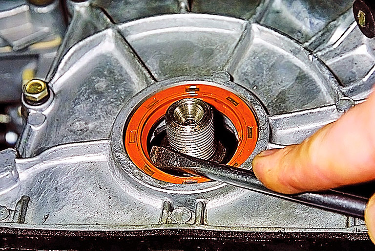 На снятой передней крышке извлечь уплотнительный элемент будет несложно. Для этого потребуется прибегнуть к помощи молотка и бородка (наставки).Чтобы выбить старый сальник из крышки, потребуется молоток и подходящая наставкаПутём нанесения несильных ударов, сальник с лёгкостью извлекается из своего посадочного места, причём выполняют эту процедуру с внутренней стороны крышки. В противном случае удалить старый уплотнитель будет проблематично.